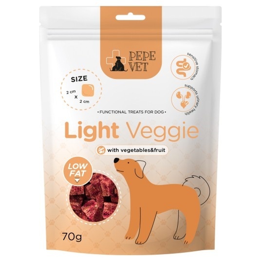 PEPE VET Light Veggie to funkcjonalne, wegetariańskie przysmaki stworzone z myślą o psach z nadwagą lub tendencją do tycia. Oparte na lekkostrawnych składnikach roślinnych, dostarczają błonnika, witamin i naturalnych minerałów, a jednocześnie są niskokaloryczne. Dzięki temu pomagają kontrolować masę ciała psa, wspierają trawienie i zapewniają uczucie sytości – bez obciążania układu pokarmowego.